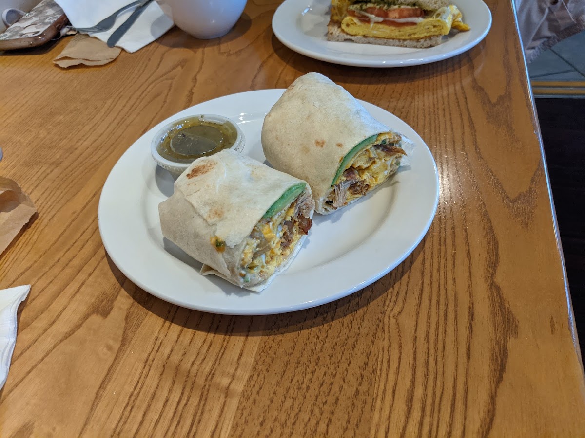 Everything we tried was very good. We stopped in on a whim on a Sunday, and judging by the parking lot, we were worried we would have to wait for a seat, but they have plenty of seating inside. We ordered at the counter and got a scone to share while we waited for or food. The blueberry scone we got was good and tasted fresh, and we did not have to wait long for our food at all, despite how busy it was! We had a table near the counter and got to see all the dishes othe patrons ordered, and let's just say we will be back to try their sandwiches they looked so good. My pulled pork breakfast burrito was very good and big enough to feed 2 people(who had a scone) and my wife's scramble was good too!